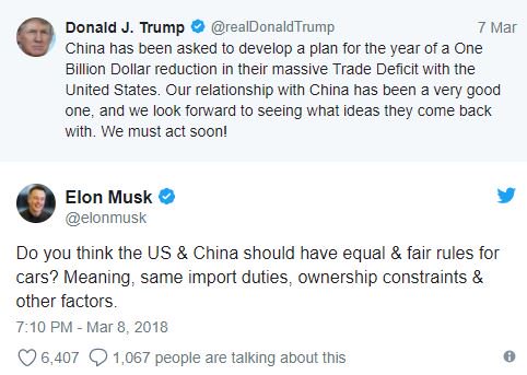 Υπέρ της επιβολής δασμών από τις Ηνωμένες Πολιτείες ενάντια της Κίνας, τάσσεται ο ιδρυτής και επικεφαλής της Tesla, Elon Musk, με αφορμή την επικείμενη επιβολή δασμών στις εισαγωγές χάλυβα και αλουμινίου (25% και 10%, αντίστοιχα) από την Ουάσιγκτον.