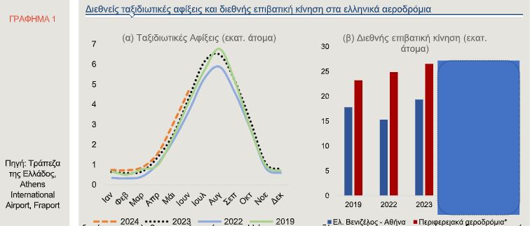Επιπρόσθετα, ιδιαίτερα ενθαρρυντικές είναι οι ενδείξεις για τον Ιούλιο, με τις διεθνείς τουριστικές αφίξεις στον Διεθνή Αερολιμένα Αθηνών και στα περιφερειακά αεροδρόμια της χώρας 1 να υπερβαίνουν τις αντίστοιχες περυσινές κατά 10,8% και 3,6% (Γράφημα 1β). Παράλληλα, η διαδικτυακή φήμη της Ελλάδας ως ταξιδιωτικού προορισμού εξακολουθεί να καταλαμβάνει μία από τις υψηλότερες θέσεις στην Ευρώπη.
