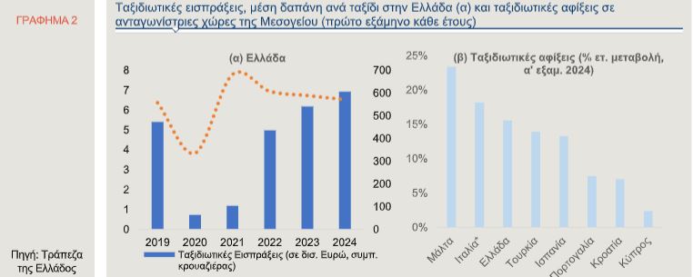 Παρά τη σημαντική άνοδο των συνολικών ταξιδιωτικών εισπράξεων, η μέση δαπάνη ανά ταξίδι των μη κατοίκων στην Ελλάδα εξακολουθεί να βρίσκεται σε πτωτική πορεία για τρίτο διαδοχικό έτος