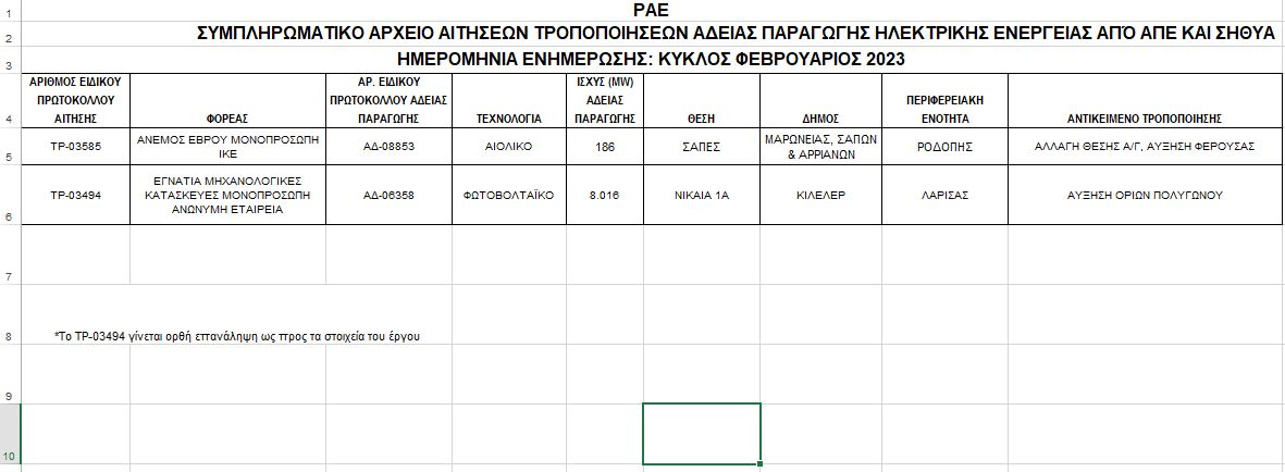 Συμπληρωματικός πίνακας αιτήσεων τροποποίησης που υποβάλλονται εντός του κύκλου υποβολής Φεβρουαρίου 2023 (σύμφωνα με το άρθρο 5 του Κανονισμού Βεβαιώσεων Παραγωγού Ηλεκτρικής Ενέργειας από ΑΠΕ και ΣΗΘΥΑ και Βεβαιώσεων Παραγωγού Ηλεκτρικής Ενέργειας Ειδικών Έργων Ανανεώσιμων Πηγών Ενέργειας (ΑΠΕ) και Συμπαραγωγή Hλεκτρισμού – Θερμότητας Υψηλής Απόδοσης (ΣΗΘΥΑ).