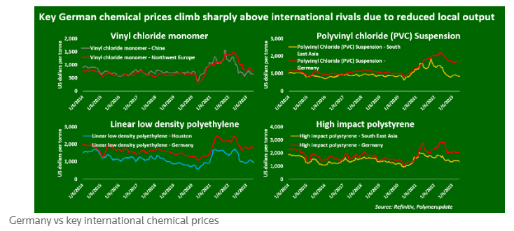 Ακόμη και οι τιμές του χλωριούχου βινυλίου, του κύριου συστατικού βάσης για την παραγωγή PVC και άλλων προϊόντων, διαπραγματεύονται με σπάνια σταθερή τιμή έναντι των κινεζικών τιμών χλωριούχου βινυλίου, οι οποίες ιστορικά ήταν πιο ακριβές από τις γερμανικές τιμές, όπως δείχνουν τα στοιχεία του Polymerupdate.