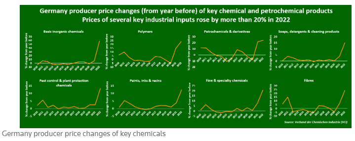 Πολλές τέτοιες επιχειρήσεις βρίσκονται σε κρίσιμη κατάσταση στη Γερμανία, η οποία ήταν ο μεγαλύτερος εισαγωγέας ρωσικού φυσικού αερίου στην Ευρώπη και η οποία συνεχίζει να παλεύει με τις τιμές ηλεκτρικής ενέργειας που παραμένουν πολύ πάνω από τους μακροπρόθεσμους μέσους όρους, με αποτέλεσμα όλες οι μεγάλες βιομηχανίες από πρώτων υλών ως αυτοκινήτων να έχουν πληγεί από απότομα άλματα στις τιμές παραγωγού στη Γερμανία, σύμφωνα με στοιχεία της VCI.