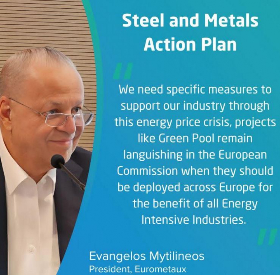 Ο πρόεδρος της Eurometaux κ. Ε.Μυτιληναίος τόνισε: Περιμένουμε πολύ περισσότερα να γίνουν, ώστε να αντιμετωπιστούν τα υψηλά ενεργειακά κόστη, που υπονομεύουν τον κλάδο μας στην Ευρώπη. Χρειαζόμαστε συγεκριμένα μέτρα για να υποστηρίξουμε τις βιομηχανίες μέσα σε αυτήν την κρίση, όπως το Green Pool που μένει στο περιθώριο από την Επιτροπή, ενώ θα έπρεπε να χρησιμοποιείται σε όλη την Ευρώπη για να βοηθά τις ενεργοβόρες βιομηχανίες.