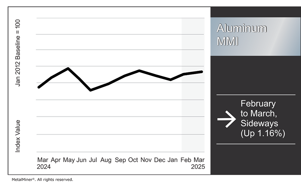 Ο Μηνιαίος Δείκτης Μετάλλων Αλουμινίου (MMI) έχει κινηθεί πλαγιοανοδικά, αυξανόμενος κατά 1,16% από τον Φεβρουάριο έως τον Μάρτιο, αντλώντας ώθηση από τις μέτριες αυξήσεις στις παγκόσμιες τιμές του αλουμινίου.