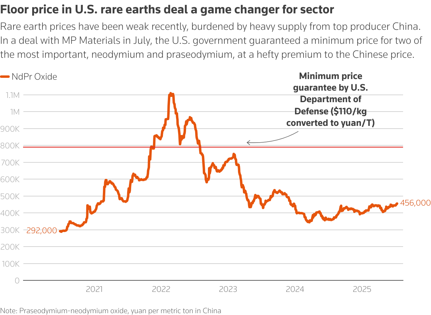 Η τιμή των 110 δολαρίων ανά κιλό για νεοδύμιο και πρασεοδύμιο (NdPr) που εγγυάται πλέον το αμερικανικό Υπουργείο Άμυνας υπερβαίνει οριακά την εκτιμώμενη τιμή-στόχο των 75 έως 105 δολαρίων που, σύμφωνα με την Project Blue, θα ήταν αναγκαία για τη διασφάλιση επαρκούς παραγωγής τα επόμενα χρόνια. Η σημερινή τιμή της αγοράς, την οποία εξακολουθεί να διαμορφώνει η Κίνα, παραμένει αισθητά χαμηλότερη, κοντά στα 63 δολάρια ανά κιλό.