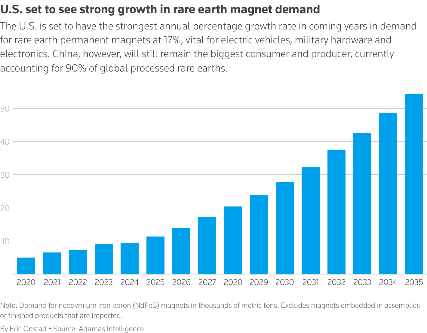 Η MP Materials, με έδρα το Λας Βέγκας, ήδη εξορύσσει και επεξεργάζεται σπάνιες γαίες, ενώ ετοιμάζεται να ξεκινήσει εμπορική παραγωγή μαγνητών στο Τέξας μέχρι τα τέλη του έτους.