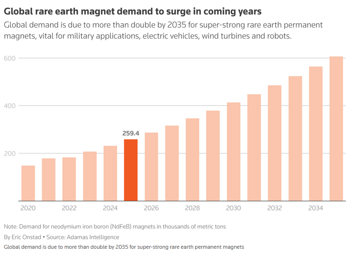 Η ίδια ανάλυση προβλέπει ότι η παγκόσμια ζήτηση για μόνιμους μαγνήτες από σπάνιες γαίες θα υπερδιπλασιαστεί μέσα στην επόμενη δεκαετία, φτάνοντας τους 607.000 τόνους.