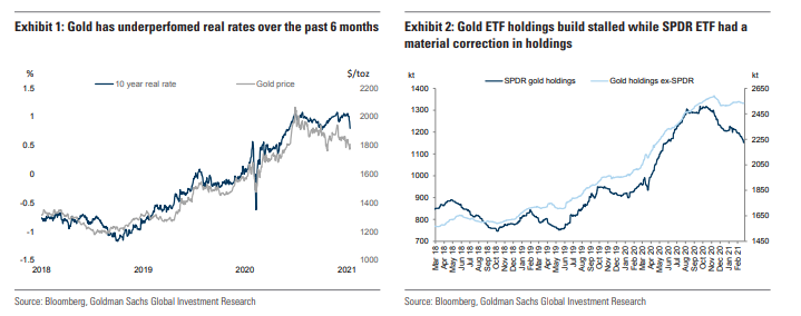 Σύμφωνα με την Goldman αυτή η αποσύνδεση συνέβη επειδή ο χρυσός διατιμήθηκε στην ισχυρή δυναμική της πραγματικής οικονομίας, ενώ τα πραγματικά επιτόκια δεν κατάφεραν να το αντικατοπτρίσουν πλήρως λόγω της νομισματικής πολιτικής της Fed. Αυτό είναι κάτι που δεν λήφθηκε υπόψη στον στόχο των $ 2300 / toz, ο οποίος βασίστηκε στην πραγματική τιμολόγηση της αγοράς, των πραγματικών επιτοκίων έναντι της οικονομικής ανάπτυξης και του κλίματος κινδύνου.