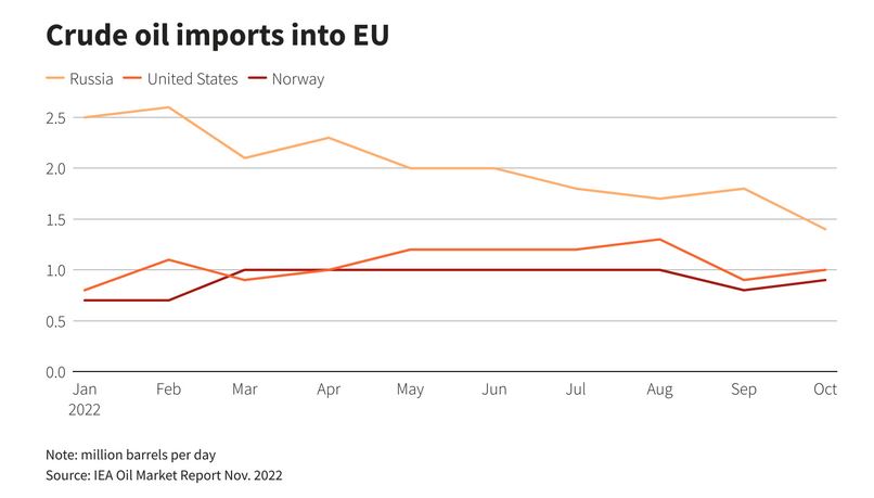 Οι εισαγωγές ρωσικού πετρελαίου στην Ευρωπαϊκή Ένωση μειώθηκαν σε 1,4 εκατομμύρια βαρέλια την ημέρα (bpd) τον Οκτώβριο από 2,5 εκατομμύρια bpd τον Ιανουάριο, σύμφωνα με τον Διεθνή Οργανισμό Ενέργειας (IEA).