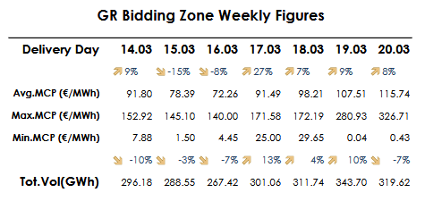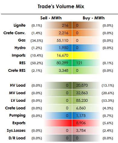 Η υψηλότερη τιμή στη διάρκεια του 24ώρου διαμορφώθηκε στα 326,71 ευρώ/MWh, ενώ το χαμηλό του 24ωρου διαμορφώθηκε στα 0,43 ευρώ/MWh.