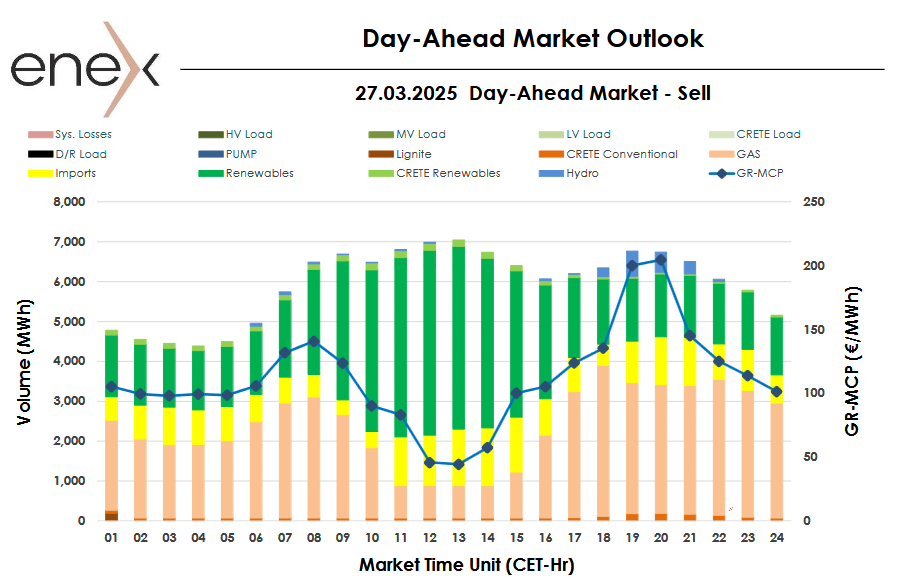 Στα 111,45 ευρώ/MWh διαμορφώθηκε η Τιμή Εκκαθάρισης Αγοράς (ΤΕΑ) της Αγοράς Επόμενης Ημέρας για αύριο 27/3/2025.
