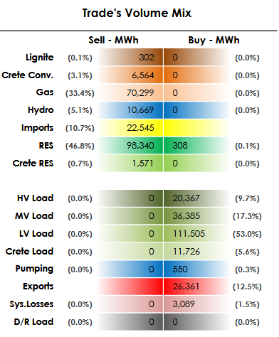 Η υψηλότερη τιμή στη διάρκεια του 24ώρου διαμορφώθηκε στα 194,88 ευρώ/MWh, ενώ το χαμηλό του 24ωρου διαμορφώθηκε στα 0 ευρώ/MWh.