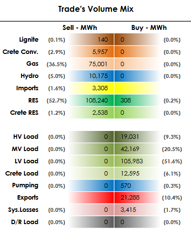 Η υψηλότερη τιμή στη διάρκεια του 24ώρου διαμορφώθηκε στα 151,23 ευρώ/MWh, ενώ το χαμηλό του 24ωρου διαμορφώθηκε στα 24,37 ευρώ/MWh.