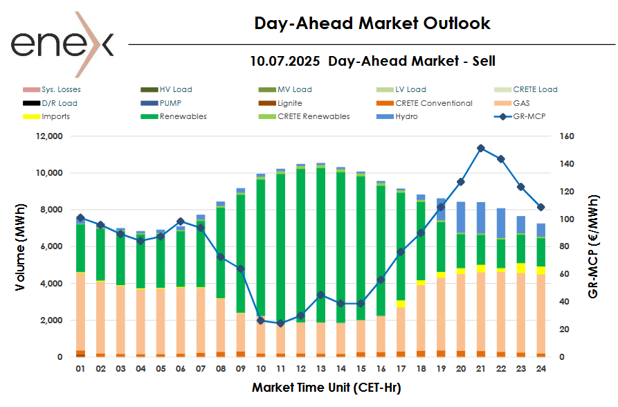 Στα 82,17 ευρώ/MWh διαμορφώθηκε η Τιμή Εκκαθάρισης Αγοράς (ΤΕΑ) της Αγοράς Επόμενης Ημέρας για αύριο 10/7/2025.