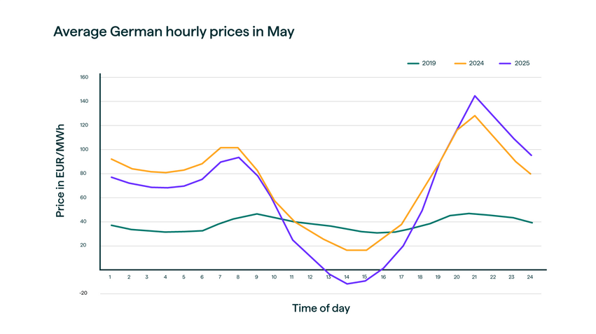 Για παράδειγμα, τον Μάιο, η μέση τιμή ηλεκτρικής ενέργειας στη Γερμανία διαμορφώθηκε στα 67,21 ευρώ/MWh – σχεδόν αμετάβλητη σε σχέση με πέρυσι.