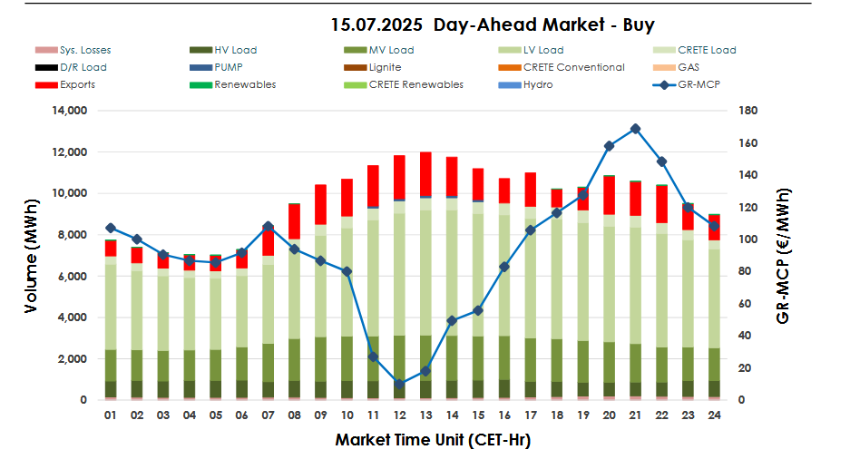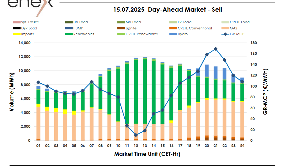 Στα 92,82 ευρώ/MWh (-11%) η Αγορά Επόμενης Ημέρας, την Τρίτη 15/7/2025