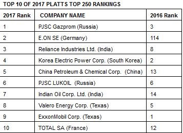 Επίσης η βιομηχανία της Ινδίας Reliance, ανέβηκε στην 3η θέση από την 8η που κατείχε το περασμένο έτος, ενώ αξιοσημείωτη είναι η άνοδος της γαλλικής Total στην 10η θέση(βρισκόταν στη 12η το 2016).
