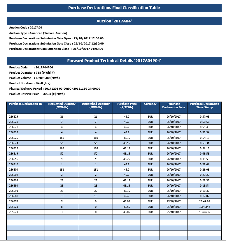 Επτά από αυτές αγόρασαν τις ποσότητες που διεκδικούσαν στα 45,15 ευρώ ανά MWh,οκτώ εταιρίες αγόρασαν προς 45,20 ευρώ, μία εταιρια αγόρασε στα 45,25 ευρώ και τρεις που διεκδικούσαν μικρές ποσότητες από 3 - 8 MWh/h αποσύρθηκαν από τη διαδικασία.
