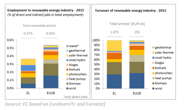Σύμφωνα με τον EurObserv'ER, το 2015 το μερίδιο της άμεσης και έμμεσης απασχόλησης σε δραστηριότητες ΑΠΕ αποτελούσε περίπου 0,37% της συνολικής απασχόλησης στην ελληνική οικονομία.