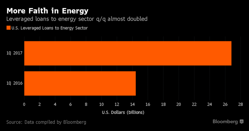 Κατά το πρώτο τρίμηνο, οι εταιρείες ενέργειας των ΗΠΑ έθεσαν 26,8 δισεκατομμύρια $ στα λεγόμενα μοχλευμένα δάνεια - δάνεια που έχουν επεκταθεί σε αυτές που ήδη κατέχουν σημαντικές ποσότητες του χρέους - έως και περίπου 86% από την ίδια περίοδο του προηγούμενου έτους, σύμφωνα με τα στοιχεία του Bloomberg .