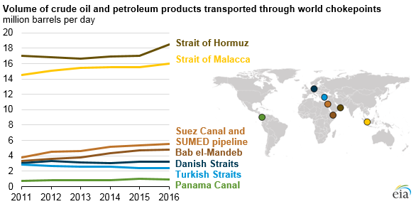 Συγκεκριμένα τα Στενά αναφέρονται ως το πιο σημαντικό σημείο συμφόρησης. Ως τέτοια ορίζονται στενά σημεία σε σημαντικές διεθνείς θαλάσσιες οδούς από τα οποία περνά η μεταφορά αργού πετρελαίου, προϊόντων του και άλλων εμπορευμάτων. Είναι στρατηγικά για την παγκόσμια παροχή πετρελαίου καθώς οποιαδήποτε επικίνδυνη κατάσταση σε αυτές τις διαδρομές επηρεάζει όχι μόνο τη μεταφορά τω προϊόντων αλλά και τις τιμές του πετρελαίου γενικότερα.