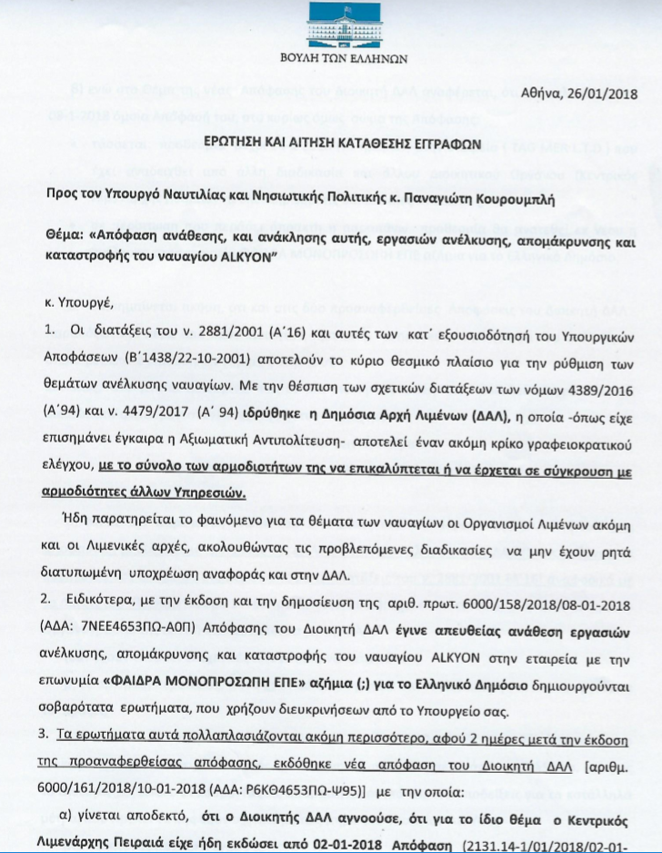 Η σχετική ερώτηση θέτει το ζήτημα για την απευθείας ανάθεση για ανέλκυση και διάλυση, σκραπ του πλοίου, την ώρα που ο Λιμενάρχης Πειραιά είχε αναθέσει αλλού τις σχετικές εργασίες.