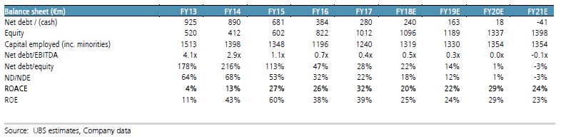 Κατά τον τρόπο αυτό και με δεδομένο ότι τα Free Cash Flows θα παραμείνουν υψηλά, ο δανεισμός που περιορίζεται θα μηδενιστεί το 2019 και η εταιρία θα μπορεί να επιστρέψει κεφάλαιο 2,5-4,5 ευρώ ανά μετοχή