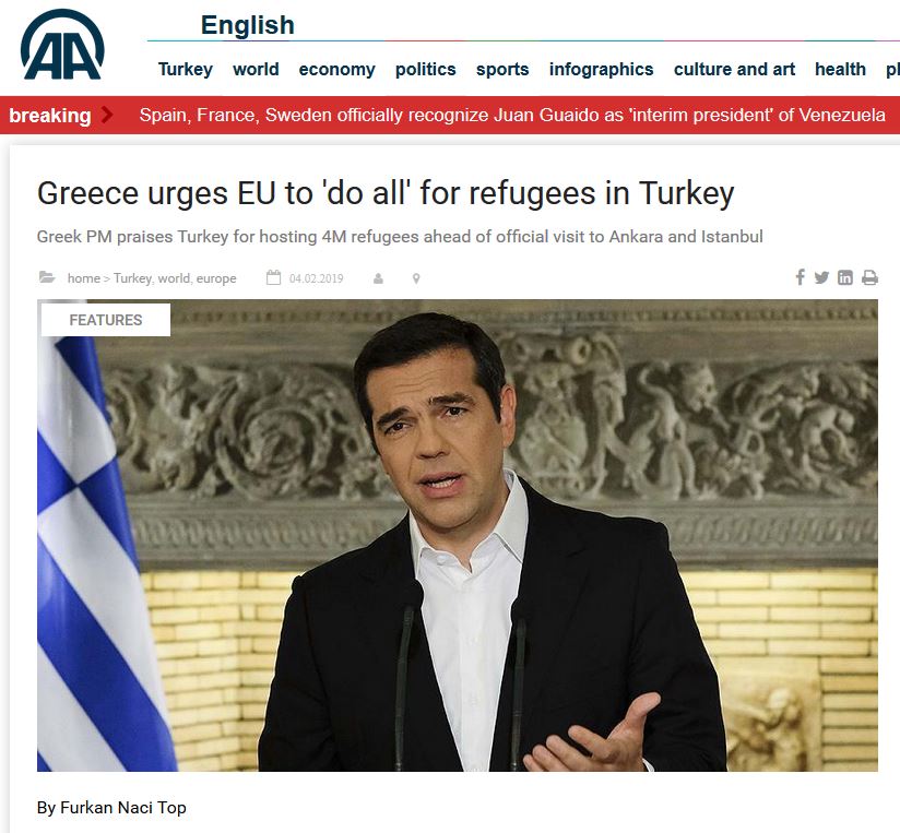 Το τουρκικό πρακτορείο ειδήσεων Anadolu παρουσιάζει τον Έλληνα πρωθυπουργού να επαινεί την Τουρκία για το γεγονός ότι φιλοξενεί 4 εκατ. πρόσφυγες