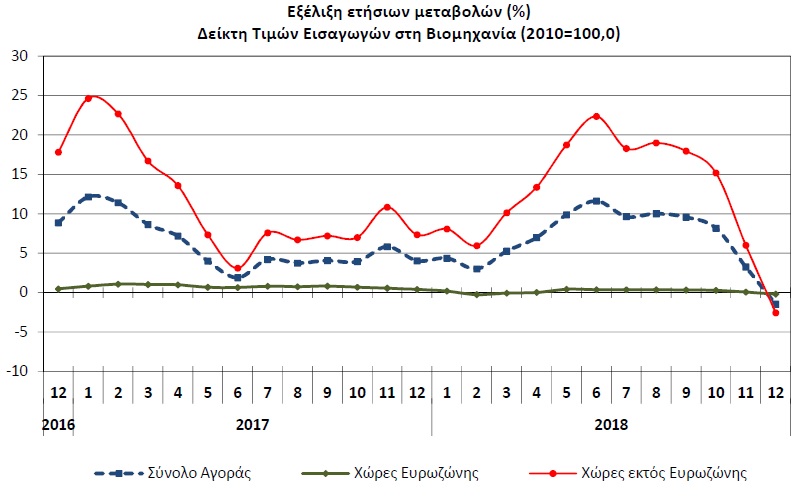 Μείωση 1,5% κατέγραψε ο Γενικός Δείκτης Τιμών Εισαγωγών στη Βιομηχανία τον Δεκέμβριο του 2018, σε σχέση με τον Δεκέμβριο του 2017, έναντι αύξησης 4,1% που σημειώθηκε κατά τη σύγκριση των αντίστοιχων δεικτών του έτους 2017 με το 2016, σύμφωνα με στοιχεία της Ελληνικής Στατιστικής Αρχής.
