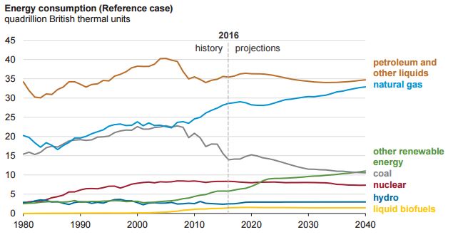 Η U.S. Energy Information αναφέρει ότι η προβλεπόμενη κατανάλωση των ανανεώσιμων πηγών ενέργειας θα αυξηθεί ταχύτερα από οποιαδήποτε άλλη πηγή έως το 2040