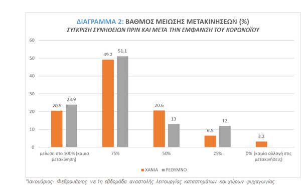 · το 90.2% ελάττωσε τις καθημερινές μετακινήσεις του κατά τουλάχιστον 50% (88.0% για το Ρέθυμνο και 90.3% για τα Χανιά)