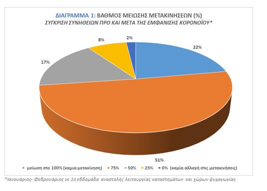 · το 72.7% του πληθυσμού έχει μειώσει τις μετακινήσεις του κατά τουλάχιστον 75% (75.0% για το Ρέθυμνο και 69.7% για τα Χανιά)