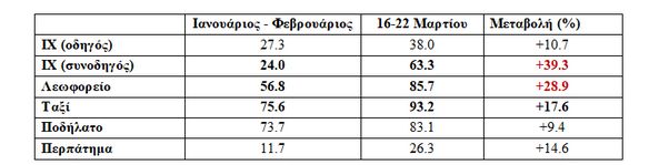 · Αντίστοιχα, σημαντική ήταν η επίπτωση στα μέσα μαζικής μεταφοράς (λεωφορείο), το οποίο απέφυγαν 28.9% περισσότεροι πολίτες από αυτούς που δεν το χρησιμοποίησαν κατά το προηγούμενο δίμηνο (Ιανουάριος-Φεβρουάριος)