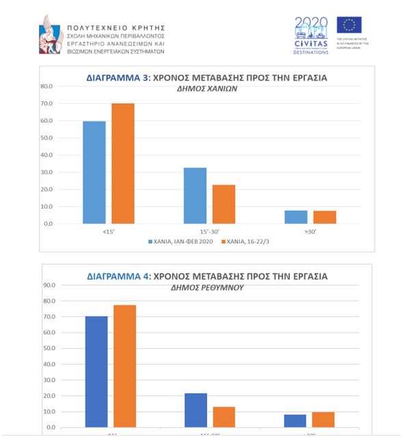 Όπως ήταν αναμενόμενο, λόγω της μειωμένης κίνησης, παρατηρήθηκε σημαντική μείωση του απαιτούμενου χρόνου για τη μετάβαση στην εργασία τους των πολιτών που συμμετείχαν στην έρευνα τόσο στο Δήμο Χανίων όσο και στο Δήμο Χανίων. Το 70% των συμμετεχόντων από τα Χανιά και το 77.4% από το Ρέθυμνο χρειάστηκαν μόλις 15 λεπτά για τη μετάβαση τους στην εργασία κατά την εβδομάδα 16-22 Μαρτίου. Το ποσοστό αυτό ήταν 59.7% και 70.3 αντίστοιχα για το διάστημα Ιανουαρίου-Φεβρουαρίου.