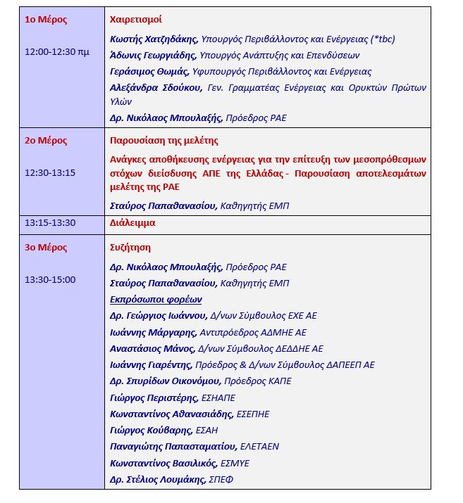 Η Ρυθμιστική Αρχή Ενέργειας, στο πλαίσιο των αρμοδιοτήτων της και με σκοπό την έγκυρη και υπεύθυνη ενημέρωση της ενεργειακής αγοράς, διοργανώνει διαδικτυακή ημερίδα την Παρασκευή 15 Μαΐου 2020 και ώρα 12:00 μ.μ., για να παρουσιάσει τη μελέτη της αναφορικά με τις ανάγκες αποθήκευσης ηλεκτρικής ενέργειας σε μεσοπρόθεσμη βάση στο Εθνικό Διασυνδεδεμένο Σύστημα (ΕΔΣ).
