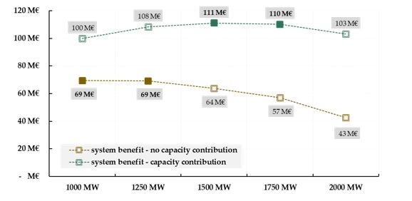 Διάγραμμα 1: Ετήσιο τελικό όφελος συστήματος από την εισαγωγή αποθήκευσης με συνδυασμό τεχνολογιών αντλησιοταμίευσης και συσσωρευτών. Έτος αναφορά το 2030 για το βασικό σενάριο του νέου ΕΣΕΚ.