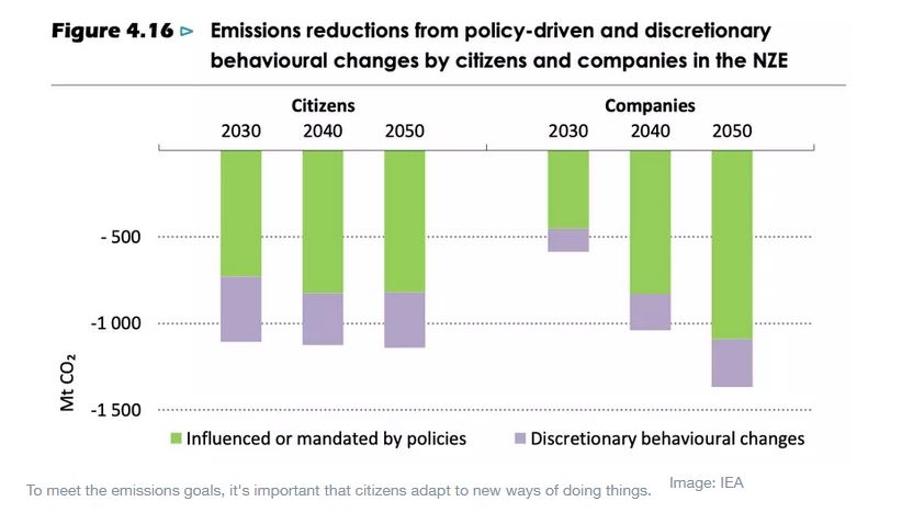 Περίπου το 75% των εκπομπών που εξοικονομήθηκαν από αλλαγές συμπεριφοράς μεταξύ 2020 και 2050 θα μπορούσαν να επηρεαστούν άμεσα από την κυβερνητική πολιτική, συμπεριλαμβανομένων μέτρων όπως η σταδιακή κατάργηση των ρυπογόνων αυτοκινήτων και η μείωση των ορίων ταχύτητας στους αυτοκινητοδρόμους.