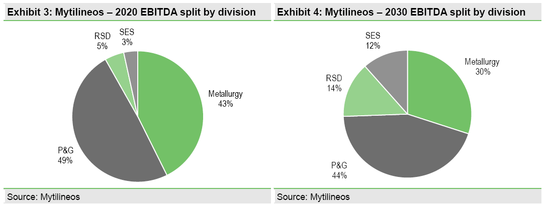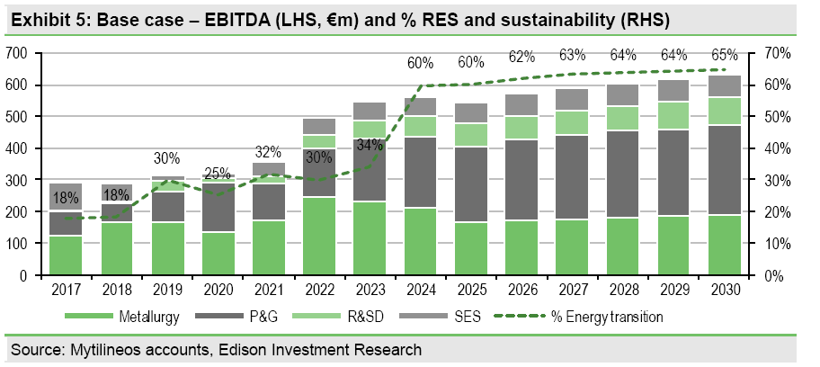 Ο αναλυτής της EDISON προβλέπει πως η MYTILINEOS θα μπορέσει να τετραπλασιάσει τα κέρδη προ τόκων, αποσβέσεων & φόρων (EBITDA) που σχετίζονται με την ενεργειακή μετάβαση. Και να πως το υπολογίζει: Από ~€80m το 2020 (δηλαδή το 25% του συνολικού -€315m- EBITDA της εταιρείας) σε ~€325m το 2025 (το 60% του συνολικού -~€540m- εκτιμώμενου EBITDA της εταιρείας).