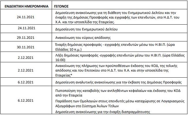 Κατωτέρω, παρατίθεται το αναμενόμενο χρονοδιάγραμμα της ολοκλήρωσης της Δημόσιας Προσφοράς της έκδοσης του ΚΟΔ και της εισαγωγής προς διαπραγμάτευση των Ομολογιών στην Κατηγορία Τίτλων
