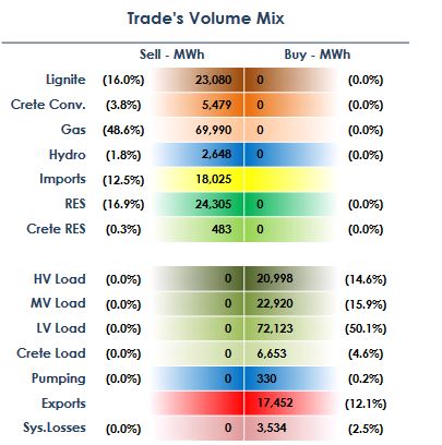 Οι εξαγωγές διαμορφώθηκαν στις 17,452 MWh και οι εισαγωγές στις 18,025 MWh.