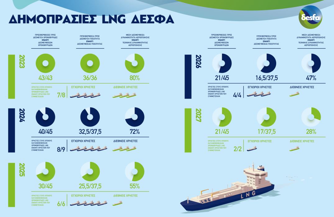 Ισχυρό ενδιαφέρον εγχώριων αλλά και διεθνών χρηστών του Εθνικού Συστήματος Φυσικού Αερίου προσέλκυσε η διαδικασία δημοπρασιών του ΔΕΣΦΑ για τη δέσμευση χρονοπαραθύρων (slot) εκφόρτωσης και δυναμικότητας αεριοποίησης στον Τερματικό Σταθμό LNG της Ρεβυθούσας για την περίοδο 2023-2027. Τον προηγούμενο μήνα οριστικοποιήθηκε ο ετήσιος προγραμματισμός για τα έτη 2023, 2024, 2025 και 2026, ενώ πρόσφατα ολοκληρώθηκε και η σχετική διαδικασία για το 2027.
