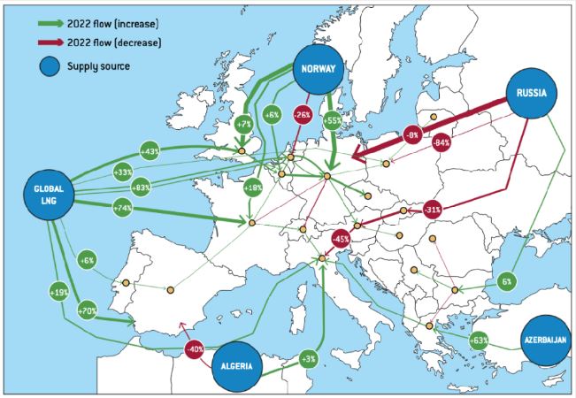 Μέχρι το τέλος του 2022, η ΕΕ είχε μειώσει σημαντικά την κατανάλωση φυσικού αερίου και είχε αναδιαρθρώσει πλήρως τα μερίδια του εμπορίου με διαφορετικούς προμηθευτές. Η Νορβηγία αύξησε τις εξαγωγές προς την ΕΕ, καθιστώντας την τον μεγαλύτερο ενιαίο προμηθευτή, ενώ οι παραδόσεις αγωγών από τη Ρωσία μειώθηκαν περίπου στο ένα τέταρτο του προηγούμενου έτους. Το Υγροποιημένο Φυσικό Αέριο (LNG) ξεπέρασε τους αγωγούς και έγινε η νέα κύρια πηγή φυσικού αερίου, με τις παραδόσεις από τις ΗΠΑ να έχουν υπερδιπλασιασθεί, καθώς και μεγαλύτερους όγκους από το Κατάρ, μεταξύ άλλων εξαγωγέων.