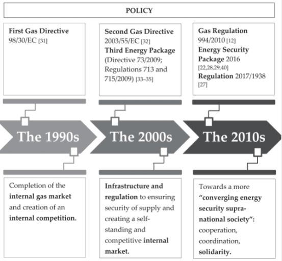 Η ασφάλεια του εφοδιασμού από τη δεκαετία του 1990, με την έννοια να ενσωματώνεται επίσημα στην ευρωπαϊκή πολιτική φυσικού αερίου μέσω της Οδηγίας 67/2004. Ωστόσο, μόλις με τον πρώτο επίσημο «Κανονισμό για την ασφάλεια του εφοδιασμού» το 2010, η ενίσχυση της ανθεκτικότητας των ευρωπαϊκών προμηθειών φυσικού αερίου έγινε σαφής κοινός στόχος της Ένωσης.