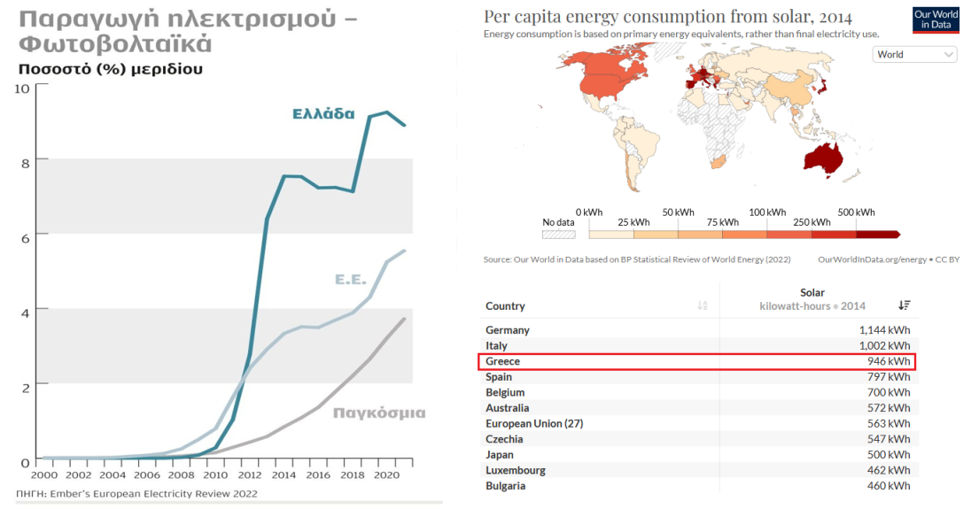 Περήφανοι, που το 2014 ανεβάσαμε την Ελλάδα πολύ ψηλά, στην 3η καλύτερη παγκόσμια θέση στην ανά κάτοικο παραγωγή φωτοβολταϊκής ενέργειας.