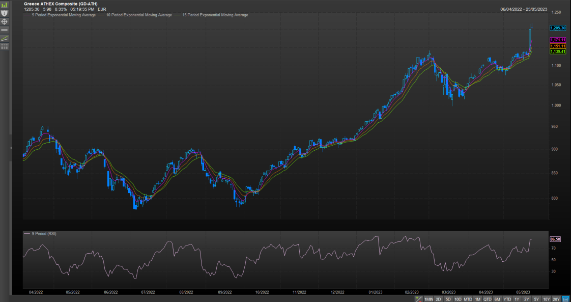 Επιβεβαιωθηκε για μια ακομη φορα με πανηγυρικο τροπο αυτη η στατιστική αναλυση, ότι η ταση παραμενει η ίδια όπως ηταν και πριν απο τις εκλογες.Κατα συνεπεια βρισκόμαστε σε ισχυροτατη μακροχρονια ανοδικη ταση στην αγορα μας, η οποια ενισχύεται συνεχως.Απο πλευρα κυματικης θεωριας Elliott waves,εχουμε συνεχεια του τριτου ανοδικου κυματος το οποιο κατακτα διαρκως νεα υψηλα,κανοντας βεβαια και τις απαραιτητες διορθωσεις ώστε να εκτονώνεται,κυριως πανω στους ημερησιους εκθετικούς κινητους μεσους ΕΜΑ 5-10-15 ημερων.
