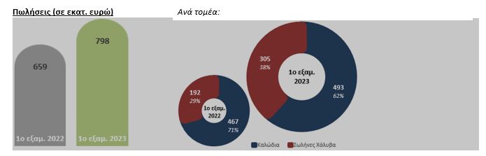Οι πωλήσεις στον τομέα καλωδίων ανήλθαν σε 493 εκατ. ευρώ (+6% σε σχέση με το α’ εξάμηνο του 2022), με την αύξηση να οφείλεται κυρίως στα μεγάλα έργα υποδομής (+15% αύξηση εσόδων σε σχέση με το α’ εξάμηνο του 2022). Η σταθερή ζήτηση για προϊόντα καλωδίων σε όλες τις κύριες αγορές (δηλαδή Κεντρική Ευρώπη, Ηνωμένο Βασίλειο, Βαλκάνια, Νοτιοανατολική Μεσόγειος) συνέβαλε στη βελτίωση των περιθωρίων κέρδους ανά τόνο πωληθέντος προϊόντος για ηλεκτρικά και τηλεφωνικά καλώδια. Το γεγονός αυτό σε συνδυασμό με το πλήρες πρόγραμμα παραγωγής, το βελτιωμένο μείγμα πωλήσεων και τα σταθερά υψηλά περιθώρια κέρδους στα καλωδιακά έργα αύξησαν το αναπροσαρμοσμένο EBITDA κατά 26% (+12,3 εκατ. ευρώ) σε σχέση με το α’ εξάμηνο του 2022.
