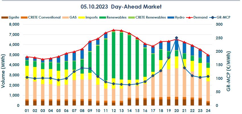 Στα 113,54 ευρώ/MWh διαμορφώθηκε η Τιμή Εκκαθάρισης Αγοράς (ΤΕΑ) της Αγοράς Επόμενης Ημέρας για αύριο 5/10/2023.