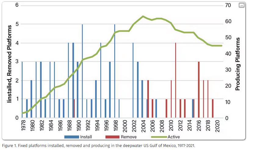 Το 2022, υπήρχαν 45 σταθερές πλατφόρμες και δύο συμμορφούμενοι πύργοι στον Κόλπο του Μεξικού των ΗΠΑ σε βάθος νερού μεγαλύτερο από 122 μέτρα (400 πόδια) και 47 πλωτές κατασκευές: 18 δοκοί, 14 TLP, εννέα ημι-υποβρύχια, τρεις πλατφόρμες ποδιών μίνι. MTLP), ένα MOPU και δύο FPSO. Όλες οι δομές παραγωγής είναι κυρίως παραγωγοί πετρελαίου, πράγμα που σημαίνει ότι το μεγαλύτερο μέρος της ροής παραγωγής τους είναι υγροί υδρογονάνθρακες (αργό πετρέλαιο και συμπύκνωμα) και όλες οι δομές παρήγαγαν εκτός από σταθερές πλατφόρμες που εξυπηρετούν βοηθητικό (δηλαδή κόμβο μεταφοράς).