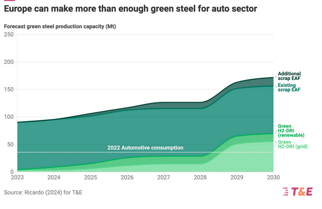 Η T&E ανακοίνωσε ότι τουλάχιστον το 40% του χάλυβα στα νέα αυτοκίνητα θα πρέπει να είναι πράσινο έως το 2030. Το 2035 το ποσοστό να αυξηθεί στο 75% και το 2040 στο 100%. Οι αυτοκινητοβιομηχανίες θα πρέπει να έχουν έναν μέσο στόχο που μπορεί να επιτευχθεί σε όλα τα νέα τους αυτοκίνητα, ενώ αρχικά θα μπορούσαν να αξιοποιήσουν τον πράσινο χάλυβα στα premium μοντέλα που είναι ακριβότερα από τα υπόλοιπα μοντέλα.