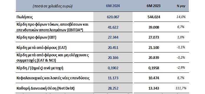 Σε σύγκριση με το αντίστοιχο εξάμηνο του 2023, σημείωσαν αύξηση, οι πωλήσεις κατά 14%, η λειτουργική κερδοφορία (EBITDA) κατά 6,7% τα κέρδη προ φόρων (ΕΒΤ) κατά 1%, ενώ υποχώρησαν τα καθαρά κέρδη (ΕAΤ) κατά -3,1%. Ο χαμηλός ρυθμός μεγέθυνσης στα Κέρδη Προ Φόρων οφείλεται κυρίως στη μείωση του μικτού περιθωρίου στις εμπορικές δραστηριότητες καθώς και στην αύξηση του χρηματοοικονομικού κόστους συνέπεια της αύξησης του επιτοκίου βάσης (Euribor) και του επιπέδου του δανεισμού.